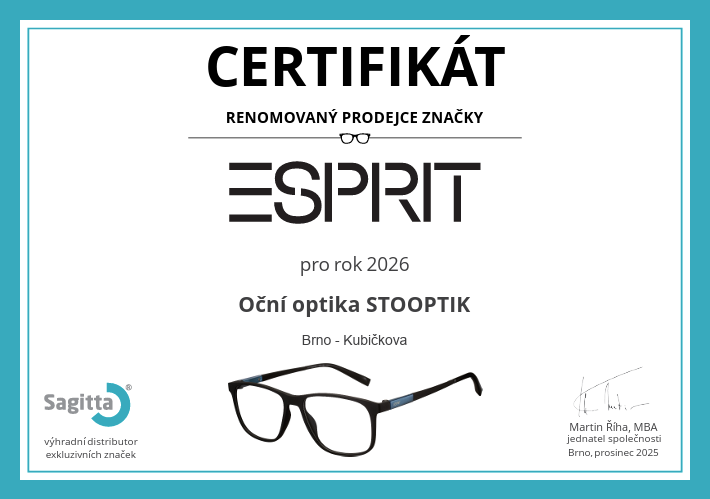 Jsme hrdí na to, že jsme získali titul Renomovaný Prodejce pro rok 2026! To potvrzuje, že u nás najdete nejaktuálnější kolekci brýlí ESPRIT s profesionálním servisem.